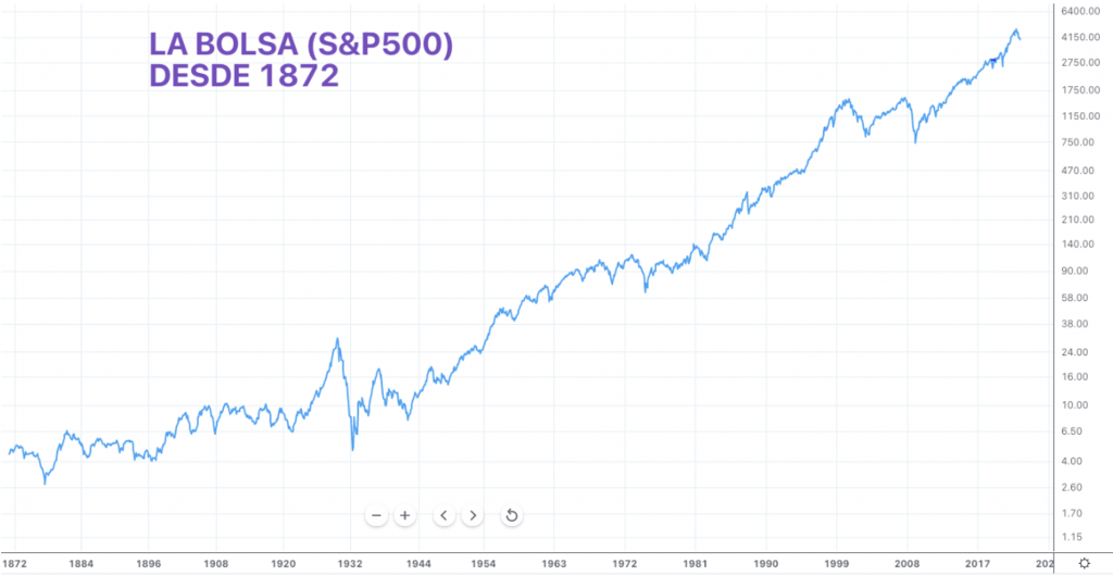 Existe una clara relación a largo plazo entre la bolsa y la economía. Ambas suben porque sube la productividad y la innovación, y eso ocurre contra viento y marea. A pesar de grandes shocks que sacuden a las economías periódicamente (ver gráfico siguiente), como la burbuja inmobiliaria en Japón que se extendió a partir de 1980 y en EEUU y España en la primera década de los años 2000, también ahora la crisis del Covid; las bolsas y la economía siguen su imparable rumbo alcista.